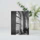 Foto em preto e branco de um homem sentado num banco silenciado contra uma enorme janela arquitetada.