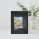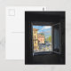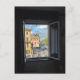 Cartão postal de janela aberta numa vila com vista para uma pequena cidade italiana.