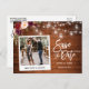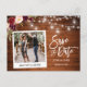 Script De Pincel Moderno, Estilo De Câmera Instantânea, Foto De Casal Salva O Cartão-Postal De Anúncio Do Noivado De Foto - Madeira De País Rústico, Luzes De Corda De Jar Mason. Inclui Watercolor Burgundy Floral com rosas, rosas vermelhas, rosas cor-de-rosa e verde botânico.