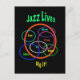 Para aqueles que amam jazz, este postal é uma celebração do melhor dos bebop e das eras do posto-bop. Círculos coloridos de vermelho, azul, roxo, branco e turquesa encerram alguns dos músicos do excelente. Tudo é ativado por textos amarelos e verdes sobre fundo preto puro.