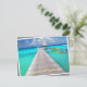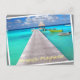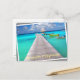 Cartão-postal de um cais de madeira com alguns barcos coloridos e uma cabana fechada na lagoa azul-turquesa de Rangiroa, ilha tropical do Pacífico, perto de Tahiti e Bora na Polinésia Francesa com borda branca e em amarelo o texto "Polinésia Francesa". A imagem é um pouco rotacionada para criar a ilusão de ela se soltar.