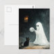 Uma cena divertida de Halloween com um fantasma que quer brincar com um gato com uma bola de fio
