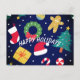 Get ready for a joyful holiday season with this super fun and festive postcard! Against a cool, deep navy blue background, we’ve gathered all the best parts of Christmas: a bright Christmas tree, a friendly gingerbread man, a tasty candy cane, and cute wreath and gift designs!