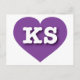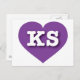 Este cartão-postal apresenta um coração roxo vibrante contendo as letras maiúsculas, brancas e em negrito KS, a abreviação oficial para Kansas, o estado de girassol. O reverso do cartão postal é vazio, aguardando seus sentimentos manuscritos ou texto personalizado.