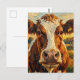 a cute postcard to say hi and keep in touch with friends and family featuring a cute impasto style cow standing on a farm. Close up of his face and a farm background.