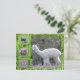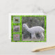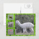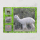 Alpaca e ovelha. No lado esquerdo do cartão estão três pequenas imagens de alpaca (superior e inferior) e ovelha (centro). A maior parte do cartão mostra uma imagem maior de uma alpaca branca. Todas as imagens são emolduradas com grama verde brilhante com gotas de orvalho.