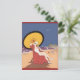 Vintage ilustra uma jovem adorável que se encontra numa cadeira de praia debaixo de um guarda-chuva na areia. Vocês podem ver o oceano atrás.