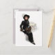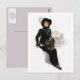 Bonito mulher em adorável roupa preta, sentada com seus pacotes e presentes. O cachorro dela está em pé no colo. Imagem vitoriana maravilhosa.