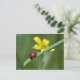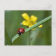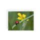 Uma ladybug (também conhecida como ladybird ou joelho) dando um passeio ao longo de uma folha de erva com uma flor amarela de rato-de-porco ao fundo. Fotografia macro tirada no Reino Unido. Personalize para adicionar seu próprio texto e outras opções.