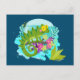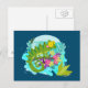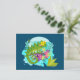 Cartaz com ilustração fofa de um lagarto tropical verde rodeado de folhas e flores de cor azul-turquesa.