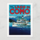 Viagens vintage do lago Como, Itália, mostrando um navio a vapor de lago com montanhas ao fundo.