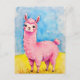 Uma ilustração adorável de uma lhama branca e amigável, rosa, com uma aquarela azul com aspecto celestial e grama verde-amarelada.