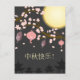 design do Festival de outono de médio com uma árvore florida e lanternas rosa e roxas. Lua de cheio sobre fundo escuro. Texto: Feliz Festival de Médios!" é personalizável.