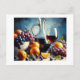 Uma disposição vibrante de frutas, incluindo laranjas e uvas, envolve um copo de vinho tinto e uma carapaça sobre uma mesa. A cena é dramaticamente iluminada, destacando as cores e reflexões ricas.