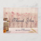 Um cartão postal de agradecimento para casamento ou outro. Projetado com um tema rústico do interior. Uma velha lata de leite enferrujada com uma linda flor amarela ao lado. Trigo e flores rosa desbotadas ao fundo contra um painel de madeira tênue.