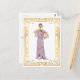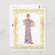 Aproveite esta série de ilustrações de moda de vintage inspirada na Art Deco. Este cartão postal de moda antigo apresenta um vestido de primeira era de 1920 em roxo lavanda com uma cintura bluson e saia em camadas. Capelet capas e uma pulseira sobre o cabelo loiro completam o olhar.