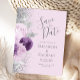 Este elegante e moderno salve a data do cartão postal apresenta um design floral roxo e lavanda aparado com falso brilho prateado. O texto personalizável combina o script de escrita manual de cinzas e a fonte de impressão em um plano de fundo de lavanda. O verso repete as informações, juntamente com um endereço de devolução personalizável.