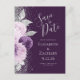 Este elegante e moderno salve a data do cartão postal apresenta um design floral roxo e lavanda aparado com falso brilho prateado. O texto personalizável combina o script de escrita manual e o tipo de letra da placa em cinza prateada num fundo roxo profundo. O verso repete as informações, juntamente com um endereço de devolução personalizável.