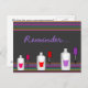 Design divertido é perfeito para salão de unhas ou cartões de lembrete de compromisso de salão de cabelos! Design apresenta uma cinza escura com faixas na parte superior e inferior em tons bonito de rosa, roxo, azul e amarelo. O gráfico principal inclui três garrafas de esmalte de unhas de vários tamanhos e em rosa quente, vermelho e roxo. Há texto na fonte de script roxo que diz "Lembrete...", mas esse texto pode ser personalizado por você. O lado inverso do cartão postal do lembrete contém todo o texto totalmente personalizável. Estes cartões postais de lembrete de unha polonesa ou salão de cabelo são a escolha perfeita para o seu negócio de unhas ou cabelos.
