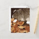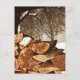 Este cartão-postal apresenta uma pilha de lenha. A madeira está empilhada no galpão. Para além da pilha de madeira está uma cena fria, de vinho nevado.