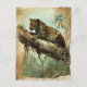 Mergulhe na beleza serena da selva com este cartão postal ao estilo da vintagem, com uma majestosa soleira leopardo num galho de árvores. Cercado por uma folhagem exuberante, a pose relaxada do leopardo captura a graça e o poder deste grande gato icônico no seu habitat natural. Perfeito para colecionadores, entusiastas da vida selvagem, ou como um presente único, este cartão postal celebra o eterno da natureza.