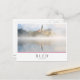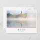 Cartaz fotográfico de um nascer nebuloso do lago Bled com reflexo da ilha com a igreja na água do lago e com o Castelo Bled ao fundo num belo dia de outono na Eslovênia com um bordo branco, com linhas nas cores branca, azul e vermelha, as cores da bandeira eslovena e o texto "Sangado, Eslovênia".