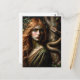Este cartão-postal apresenta trabalho de arte de pintura a óleo de Lilith ou Eve com um cobra enrolado ou embutido em uma árvore sussurrando para ela. A lendária mulher é representada com cabelo vermelho e olhos verdes. Ela tem um olhar de consideração em seu rosto. Antiga estética botânica.