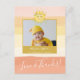 Cartões de agradecimento personalizados com foto para baby shower com tema de solzinho. O design apresenta uma ilustração pintada à mão de um sol sorridente usando uma coroa floral e um fundo listrado com arco-íris em aquarela boho com tons de rosa e amarelo. O texto pode ser personalizado de acordo com as suas necessidades (clique em "Personalizar" para editar e "Personalizar ainda mais" para fazer alterações mais avançadas). Os cartões de agradecimento perfeitos para um baby shower ensolarado de verão. Convites de sol, decorações para baby shower e presentes para recém-nascidos combinando podem ser encontrados na loja.