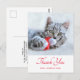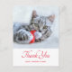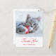 Cartão postal de agradecimento de Natal com uma fofa fotografia de Natal de um gato cinza tabby mordendo de forma brincalhona um chapéu de
