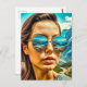 Legal arte ai retratando uma bela senhora vestindo óculos escuros com reflexo de uma cordilheira. Manter contato enquanto viaja com cartão postal.