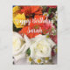 Um lindo buquê de flores amarelas, laranjas e brancas decora este cartão postal floral personalizado de Feliz Aniversário. Rosas brancas e amarelas são acentuadas por gerbera margaridas laranjas. Um cartão postal personalizado fofo com sua própria mensagem.