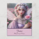 Uma bela fada rosa pálida, penteada, com asas rosa pálidas vestindo um vestido de lavanda pálido e um colar de pérolas segura uma rosa solteiro enquanto está em um campo de rosas.