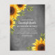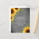 Convite de festas de lar russo, estilo country, com girassóis amarelos brilhantes em fundo de quadro.