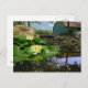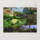 Lírios d'água em uma lagoa dominam o primeiro plano dessa imagem, com uma pequena cascata e construção ao fundo.