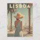 This charming vintage poster depicts a graceful woman in a classic 1950s dress standing at the harbor in Lisbon. Fishing boats gently float on the water behind her, while the sun casts a warm, golden glow over the historic buildings in the background. The soft retro color palette and nostalgic textures capture the elegance of mid-century coastal life in Portugal. Perfect for lovers of vintage fashion, seaside scenes, and timeless European travel art.