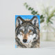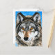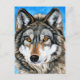 Uma pintura acrílica de um lobo cinza sobre um fundo azul.