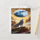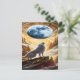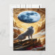 Um lobo branco está sobre uma saliência rochosa, uivando para uma grande lua azul em uma paisagem fantástica e turbilhonar. A imagem evoca um sentido de mistério e beleza selvagem.
