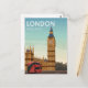 A ilustração do poster de viagens Retro London England, que apresenta um ônibus vermelho de dois andares passando pelas Casas do Parlamento, juntamente com uma vista da torre de relógio conhecida como Big Ben. Este design de colheita trará de volta as memórias de posteres de viagens clássicos de uma era passada.