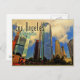 Edifícios brilhantes numa linha do horizonte de uma cidade grande fazem com que este retro pareça design de Los Angeles, pop da Califórnia, grande lugar.