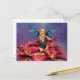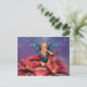Um cartão de fantasia com uma fada loira bonita sentada num buquê de orquídeas vermelhas.