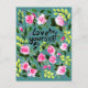 Mooie met de hand geschilderde illustratie met roze roosjes, groene blaadjes en een quote: Love yourself, op een groen blauwe achtergrond.