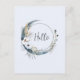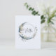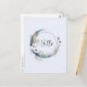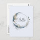 Um cartão postal com uma ilustração mística. Uma lua azul escura com um contorno fino elegante e flores brancas ao longo das suas bordas.