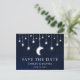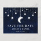 Célestial Salvar o cartão-postal de lançamento do noivado de Data. Céu azul de água com estrelas e a lua. Luzes de cordas.