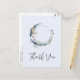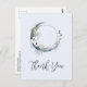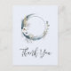 Cartão de agradecimento com uma ilustração mística. Uma lua crescente azul escura com um contorno circular fino e elegante e flores brancas ao longo de suas bordas.
