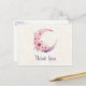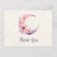Cartão de agradecimento com uma ilustração encantadora apresentando uma lua crescente rosa e roxa suave. Lindas flores silvestres rosa e amarelo adornam este corpo celeste.