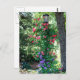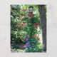 Lamppost decorado com rosas vermelhas e clematis roxa numa rua de jardim de jardim num dia de verão.