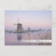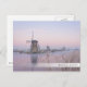 Cartão-postal de uma paisagem de conto de fadas com moinhos de vento velhos à luz pastel macia de um nascer do sol de inverno com gelo no rio e geada nas sementes de uma manhã fria em Kinderdyke, nos Países Baixos com um bar fraco e o texto "Holanda".