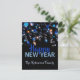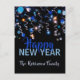 Design de cartão postal de Ano Novo personalizado com fitas brilhantes e luzes bokeh em um fundo preto. O texto é totalmente personalizável.