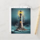 Um farol solitário emite luz sobre um afloramento rochoso enquanto as ondas subem em sua base, criando uma vista noturna serena.