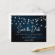 Cartão Postal de Anúncio de Salvar a Data com Luzes de Corda de Madeira Rústica Azul Marinho - O Save the Date perfeito para os noivos que amam um tema rústico. Madeira rústica com luzes de corda brilhantes e tipografia script. O verso do modelo permite o endereço de retorno e código QR para o site do casamento. Save the Date faz parte de uma coleção.